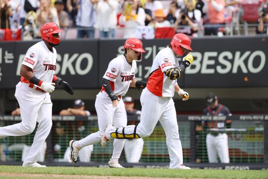 23일 광주 KIA챔피언스필드에서 열린 2024 KBO리그 한화 이글스와 KIA타이거즈 더블헤더 1차전, 5회말 1사 1, 2루 상황 KIA 나성범이 동점 3점포를 날린 뒤 홈으로 돌아와 동료들과 기뻐하고 있다. 이날 이 홈런으로 나성범은 개인통산 2800루타를 기록했다.(사진=KIA타이거즈 제공) 2024.06.23.