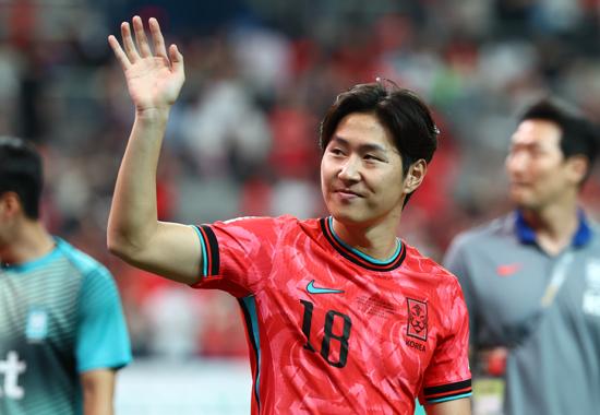 11일 오후 서울 마포구 서울월드컵경기장에서 열린 2026 국제축구연맹(FIFA) 북중미 월드컵 아시아 지역 2차 예선 조별리그 C조 6차전 한국과 중국의 경기, 1-0으로 승리를 거둔 한국 이강인이 관중석을 향해 인사하고 있다. 2024.06.11.