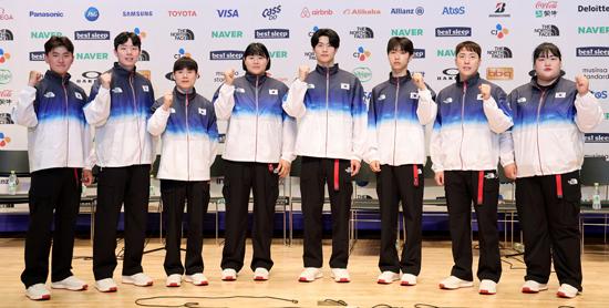 26일 충북 진천국가대표선수촌 챔피언하우스에서 열린 2024 파리하계올림픽대회 D-30 미디어데이 대한민국선수단 기자회견에서 국가대표 선수들이 기념촬영을 하고 있다. 왼쪽부터 양궁 김제덕, 배드민턴 서승재, 체조 김한솔, 유도 김하윤, 수영 황선우, 태권도 박태준, 탁구 임종훈, 역도 박혜정. 2024.06.26.