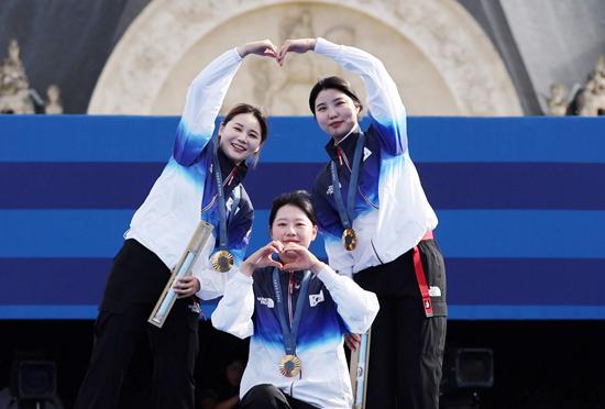 임시현, 전훈영, 남수현이 28일(현지시간) 프랑스 파리 레쟁발리드에서 열린 파리 올림픽 양궁 여자 단체전 시상식에서 금메달을 목에 걸고 세리머니를 하고 있다. 2024.07.29.