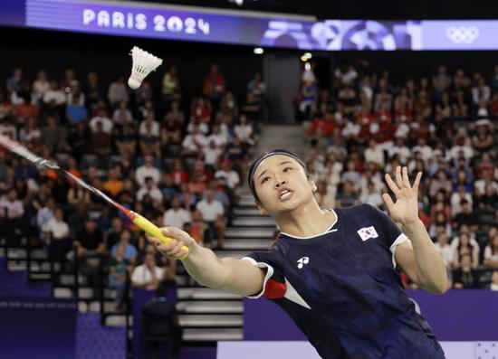 안세영이 4일(현지시각) 프랑스 파리 아레나 포르트 드 라샤펠에서 열린 2024 파리 올림픽 배드민턴 단식 준결승에서 인도네시아 그레고리아 마리스카 툰중을 상대로 경기를 펼치고 있다. 2024.08.04.