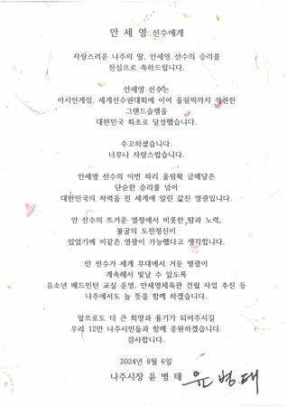 윤병태 나주시장이 안세영 선수에게 보낸 축전. /나주시 제공
