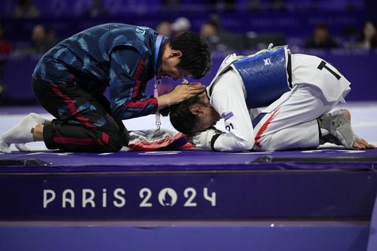 파니팍 웡파타나낏(태국, 오른쪽)이 7일(현지시각) 프랑스 파리의 그랑 팔레에서 열린 2024 파리올림픽 태권도 여자 49㎏급 정상에 오른 후 최영석 감독에게 큰절을 하고 있다. 이번 올림픽을 끝으로 은퇴를 밝힌 웡파타나낏은 결승에서 궈칭(중국)을 2-1로 꺾고 우승, 태국 올림픽 사상 처음으로 종목 2연패를 달성했다. 2024.08.08.
