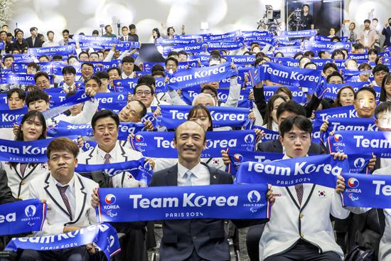 12일 서울 송파구 올림픽파크텔에서 열린 2024 파리 패럴림픽대회 대한민국 선수단 결단식에서 선수단이 팀 코리아라고 적힌 머플러를 들고 기념촬영을 하고 있다. 2024.08.12.
