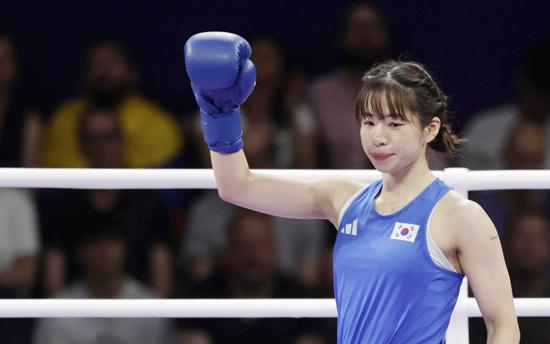 임애지가 4일(현지시각) 프랑스 노스 파리 아레나에서 열린 2024 파리 올림픽 복싱 여자 54kg급 준결승에 입장하며 인사하고 있다. 2024.08.04.