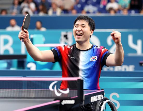 김영건이 7일(현지시각) 프랑스 사우스 파리 아레나에서 열린 2024 파리 패럴림픽 탁구 남자 단식(스포츠등급 MS4) 결승에서 금메달을 확정 지은 뒤 기뻐하고 있다. (사진=대한장애인체육회 제공) 2024.09.08.