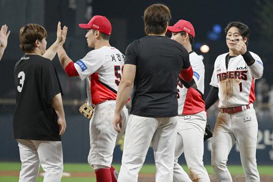 7일 오후 광주 북구 광주-기아챔피언스필드에서 열린 2024 신한 SOL뱅크 KBO리그 KIA 타이거즈 대 키움 히어로즈의 경기, 6-2 승리를 거둔 KIA 선수들이 자축하고 있다. 2024.09.07.
