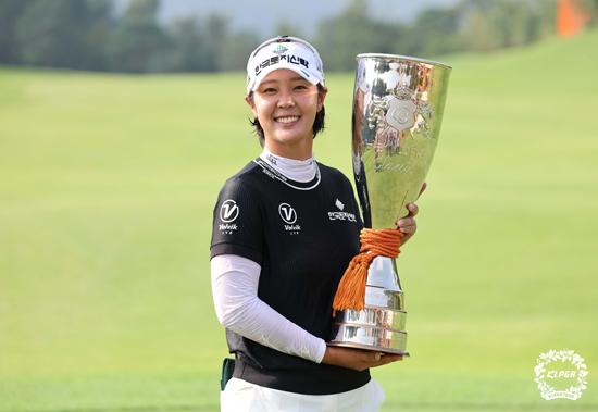 25일 강원 춘천시 제이드팰리스CC에서 열린 \'한화 클래식 2024\' FR, 우승한 박지영이 트로피를 들고 기념촬영을 하고 있다. (사진= KLPGT 제공) 2024.08.25.