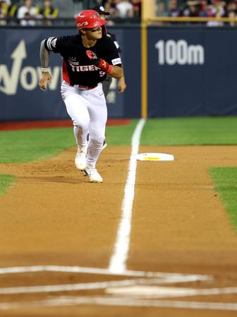 19일 오후 서울 송파구 잠실야구장에서 열린 2024 KBO리그 KIA 타이거즈와 두산 베어스의 경기, 1회초 무사 주자 3루 상황에서 KIA 김도영이 홈으로 달리고 있다. 2024.09.19.
