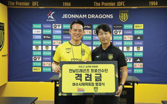 이날 경기전 전남도체육회장협의회 회장인 여수시체육회 명경식 회장은 기자실을 찾아 전남 이장관 감독에게 ‘K리그1부 승격을 위하여! 전남드래곤즈 프로선수단 격려금’을 전달했다.