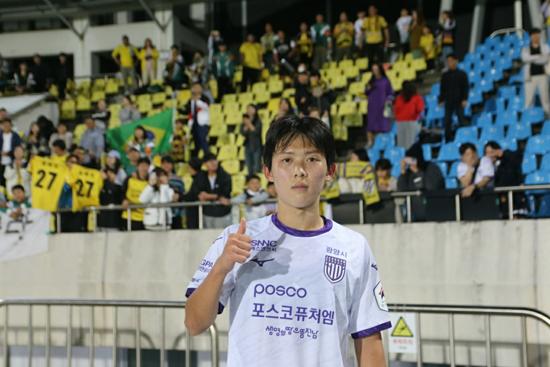 전남 윤재석이 극장골 이후 팬들과 기쁨을 나누고 있다. /전남드래곤즈 제공