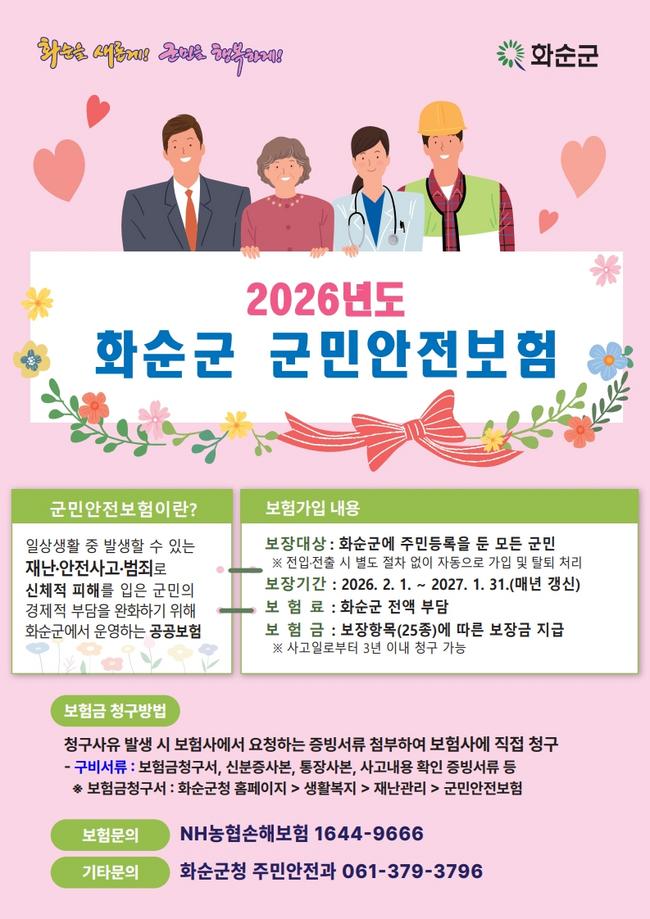 화순군은 10일 일상생활 중 발생할 수 있는 각종 재난과 안전사고로부터 군민의 경제적 부담을 덜어주기 위해 ‘2026년도 군민안전보험’을 운영한다고 밝혔다.