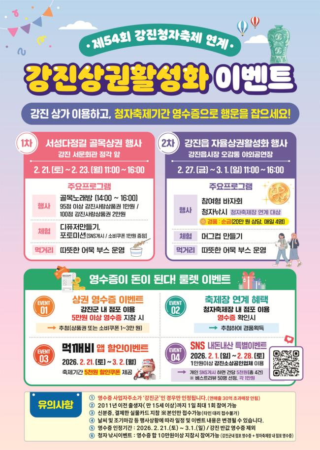강진군이 제54회 강진청자축제를 맞아. 지역 상권 이용을 촉진하고 소비 분위기를 확산하기 위한 ‘강진상권활성화 이벤트’를 진행한다.
