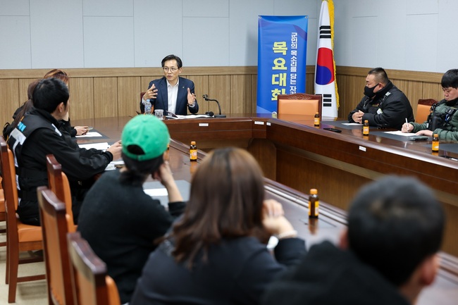 영암군이 20일 삼호읍행정복지센터에서 ‘소통의 창을 여는 시간, 목요 대화’를 열어 배달대행기사 등 배달업 종사자들의 애로사항을 듣고, 안정적 근무 환경 조성을 위해 다양한 이야기를 나눴다.