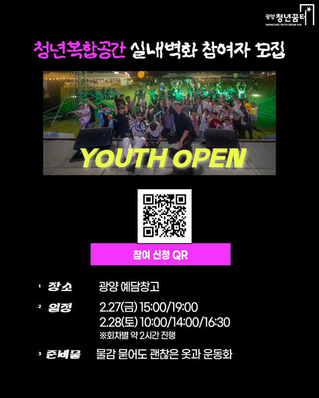 한편, 청년복합공간 실내벽화 프로젝트 참여자 모집과 관련된 자세한 사항은 광양청년꿈터 누리집 또는 전화 문의(☎061-818-2020)를 통해 확인할 수 있다.