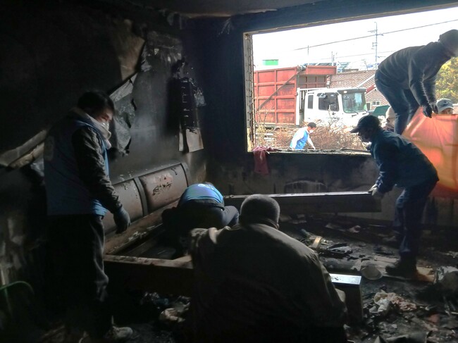 참여 대원들은 훼손된 내부 공간을 정비하고 불에 탄 가구와 집기류를 정리하는 등 현장 복구 작업을 이어갔다.