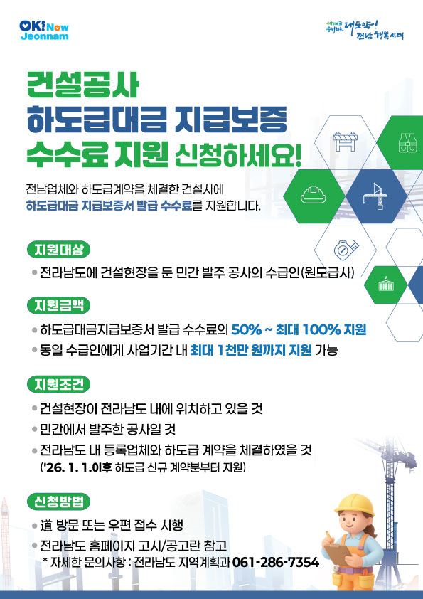 전라남도가 건설산업 활력을 높이고 하도급 업체 보호를 위해 ‘2026년 건설공사 하도급대금 지급보증 수수료 지원사업’을 확대 추진한다.