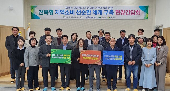 도는 17일 순창군 인계면 다시청춘관에서 장수군·순창군 관계자와 전문가 등이 참석한 가운데 ‘지역소비 선순환 체계 구축 현장간담회’를 열고 농어촌 기본소득이 지역경제 활성화로 이어질 수 있는 실행 전략을 논의했다.