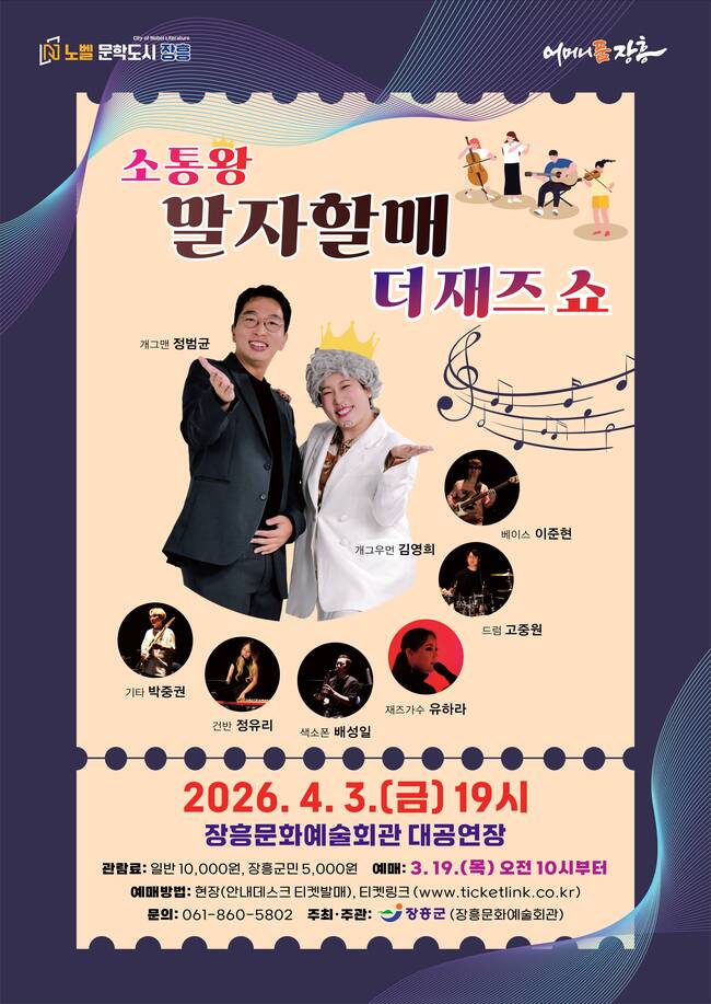 장흥군은 오는 4월 3일(금) 저녁 7시 장흥문화예술회관 대공연장에서 ‘소통왕 말자 할매 더 재즈 SHOW’ 토크 콘서트를 개최한다고 전했다.