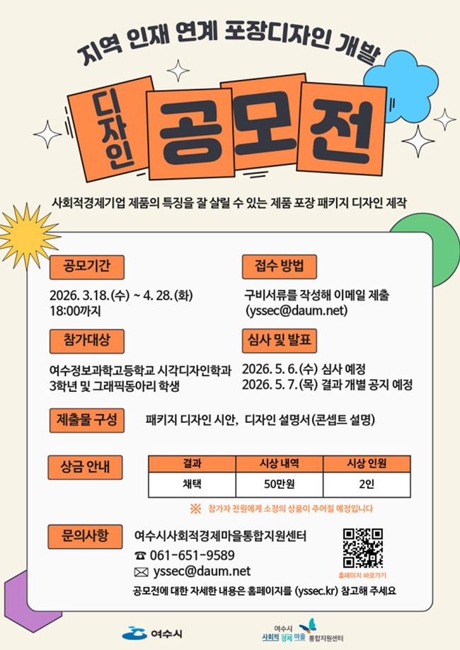 여수시는 관내 사회적경제기업 제품의 브랜드 경쟁력 강화를 위해 ‘지역 인재 연계 포장디자인 개발 공모전’을 본격 추진한다고 밝혔다.