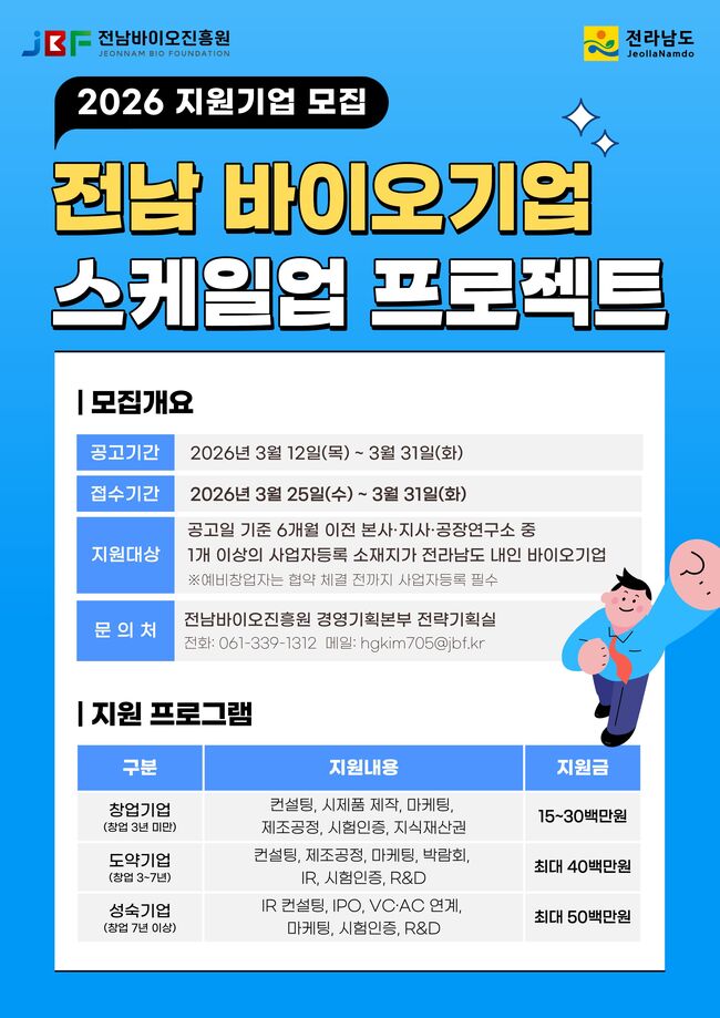 전라남도가 2026년 신규사업으로 ‘전남 바이오기업 스케일업 프로젝트’를 본격 가동하고, 참여기업 모집에 나섰다.