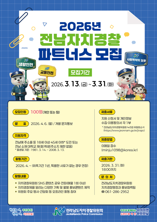 전라남도자치경찰위원회는 도민과의 소통을 강화하고 현장 중심 자치경찰 치안 활동을 함께할 ‘2026년 전남자치경찰 파트너스’를 31일까지 모집한다고 밝혔다.