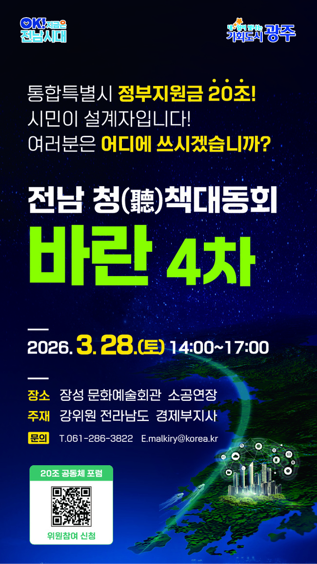 이번 ‘바란’은 ‘20조 시민공동체 포럼’의 출발 신호다. 전남도는 전남·광주 통합특별시 출범을 앞두고, 정부 지원 20조 원 재정의 활용 방향을 시·도민과 함께 논의하는 ‘20조 시민공동체 포럼’을 시작한다.
